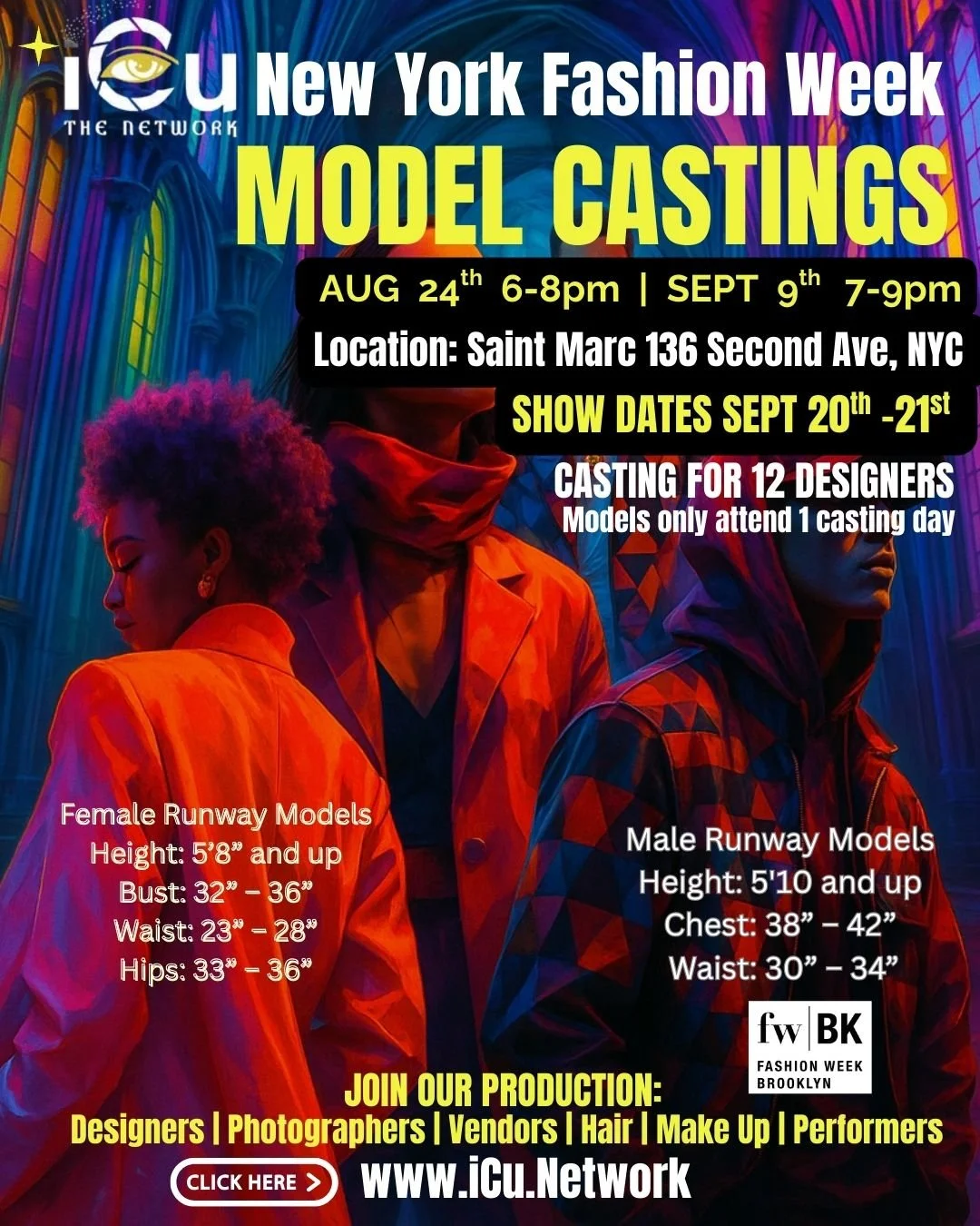 We are currently casting Designers, Brands, Performers, Models, Hair/MUA Artists, and Vendors. Interested? Email: iCuNYCFashionWeek@gmail.com